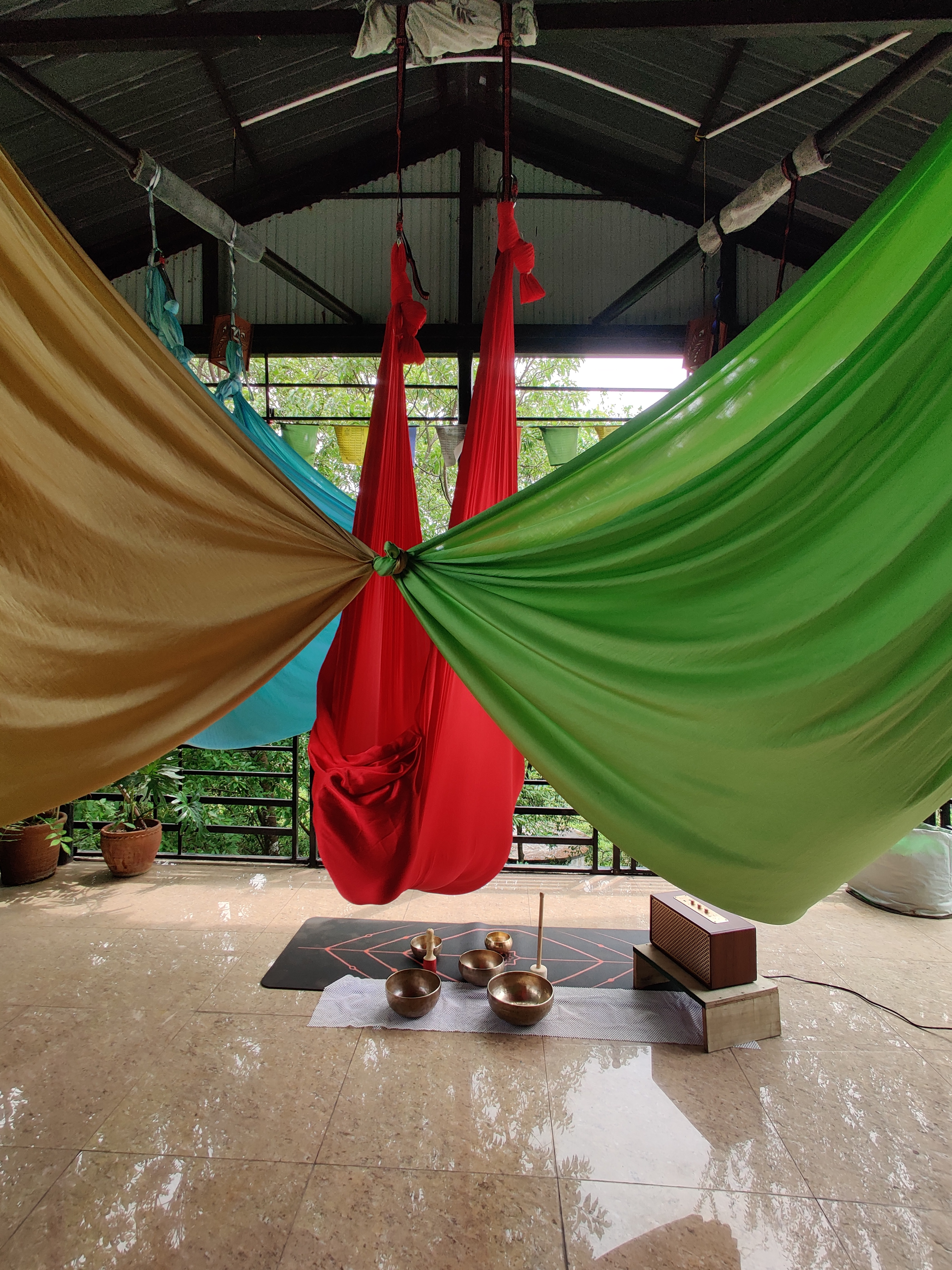 The suspended sound bath session combines suspension through aerial hammock in savasana and sound immersion feeling as if floating in space of sounds, vibrations & other healing frequencies resonating through your body like ripples in the pond.